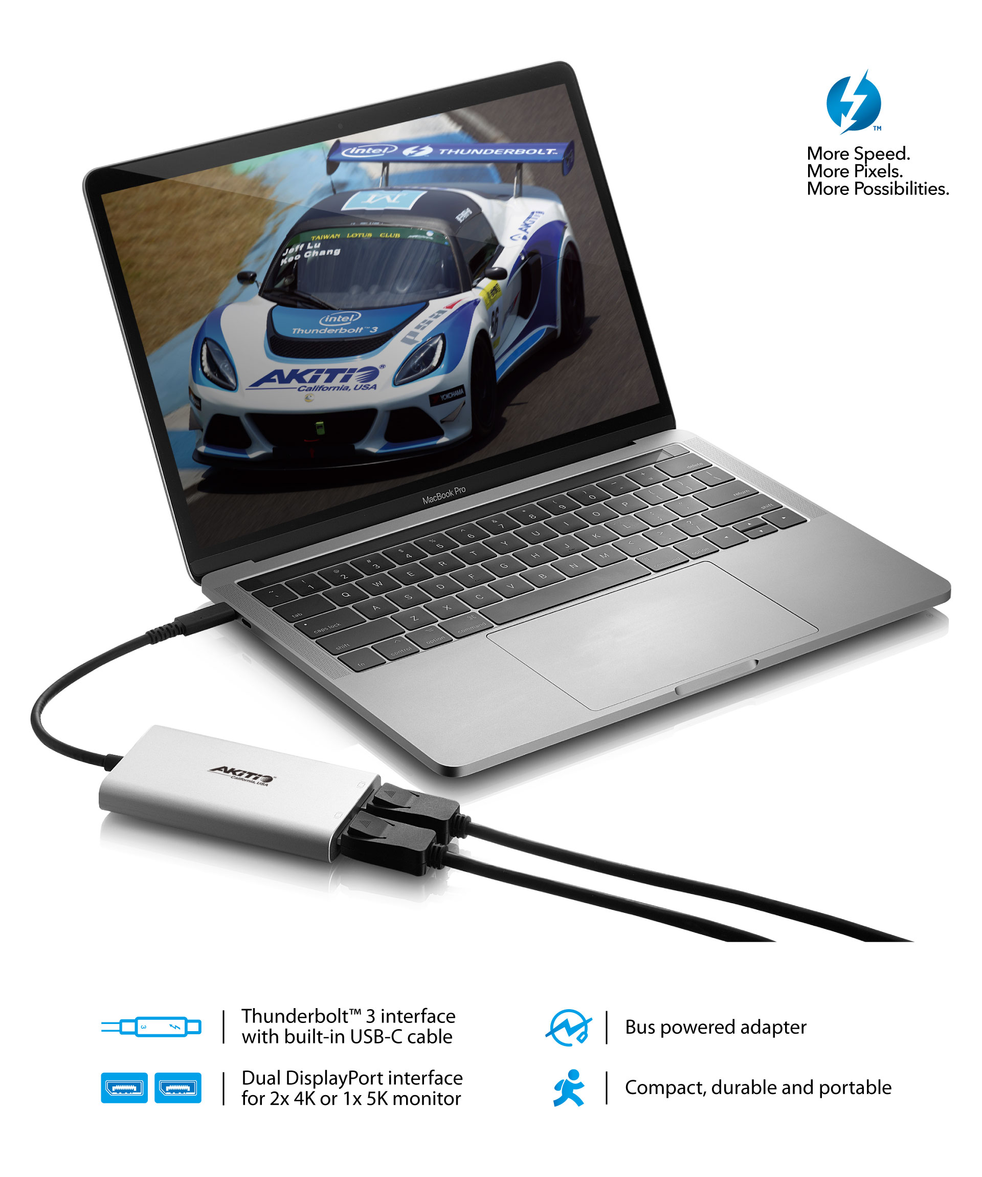This compact and durable adapter runs on bus power alone. Hassle-free with its built-in Thunderbolt 3 (USB-C) cable, this is the ideal companion for your notebook when you need to connect external DisplayPort monitors.