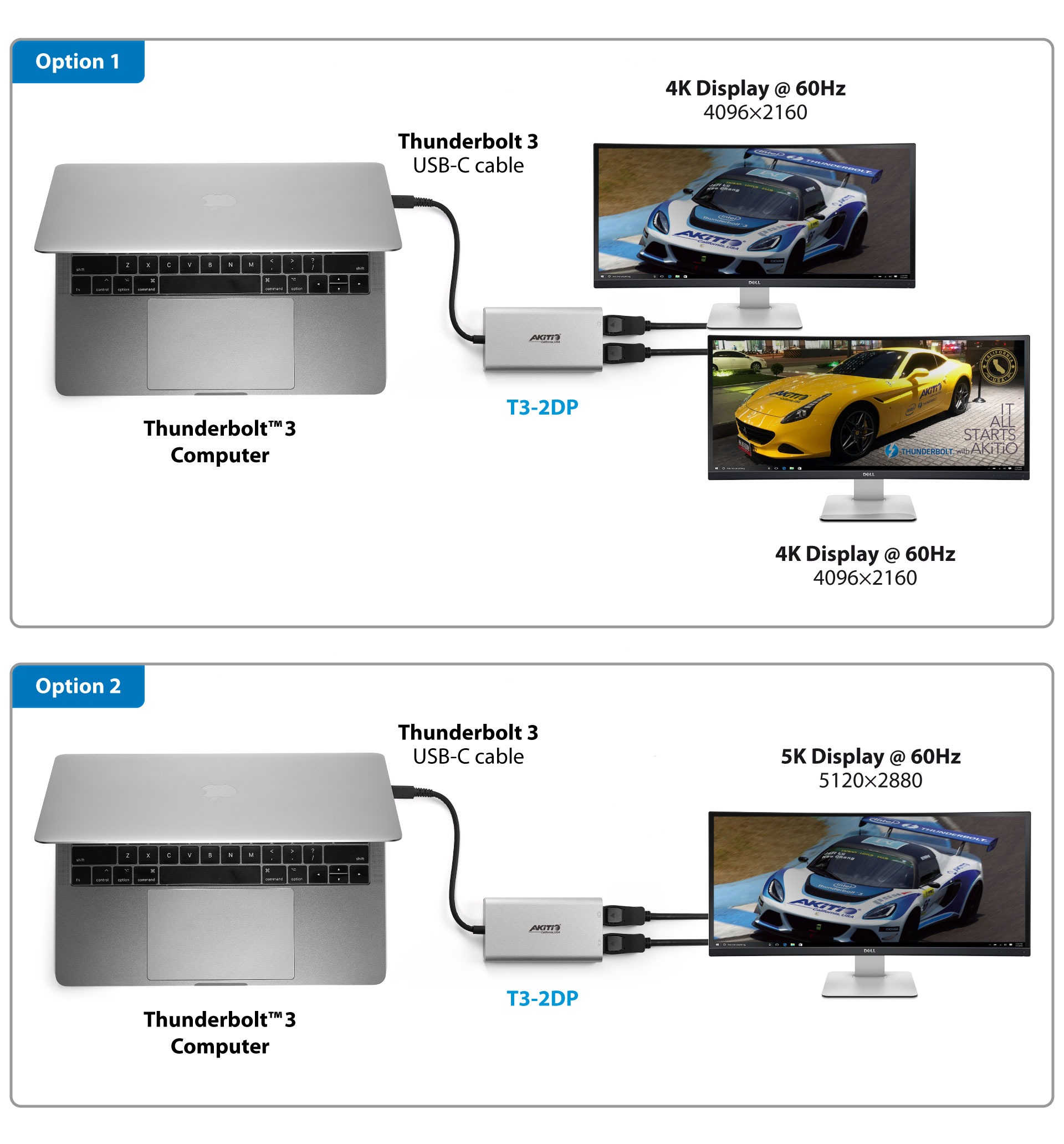 - Connects up to two 4K monnitors to a Thunderbolt 3 computer