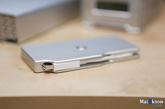 On the other side is a tethered Thunderbolt cable for the connection to the Mac.