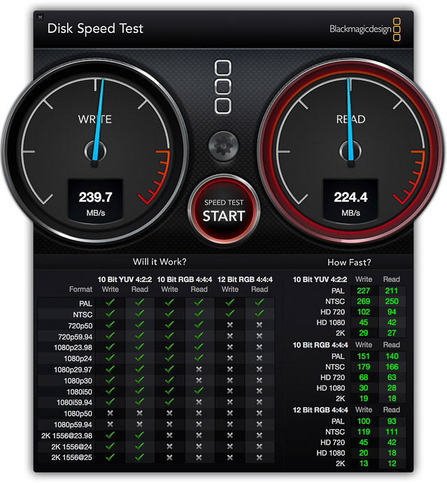 Let's do a real-world test using the eSATA to Thunderbolt interface. In this test, the 2.5" SSD by itself can achive read and write speeds of around 350 MB/s but when installed in the external eSATA enclosure it will reach around 230 MB/s.