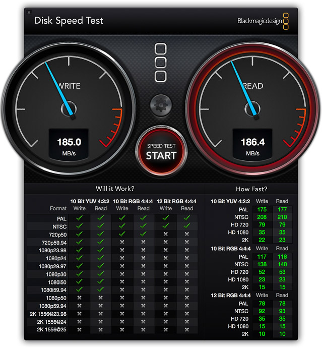 If a 3.5" desktop drive with 7200RPM is installed in the external eSATA enclosure instead, the drive can achieve read and write speeds of about 185 MB/s.