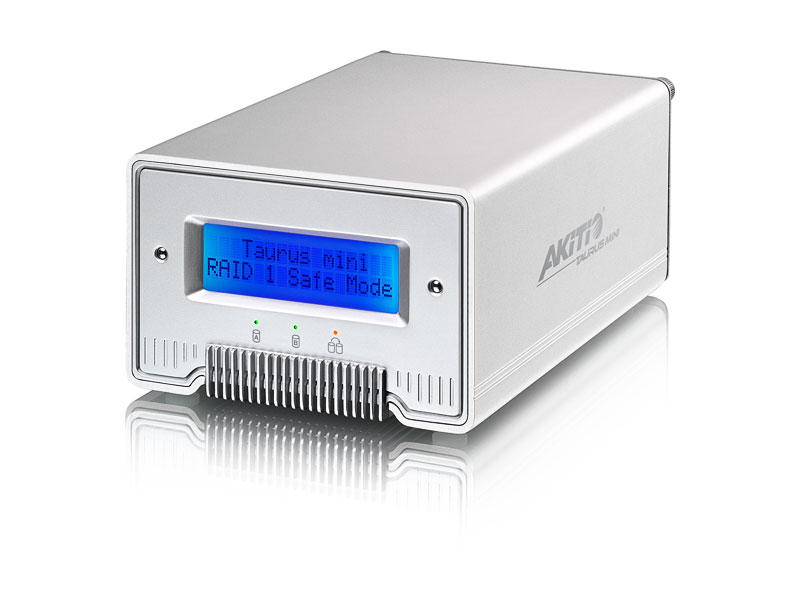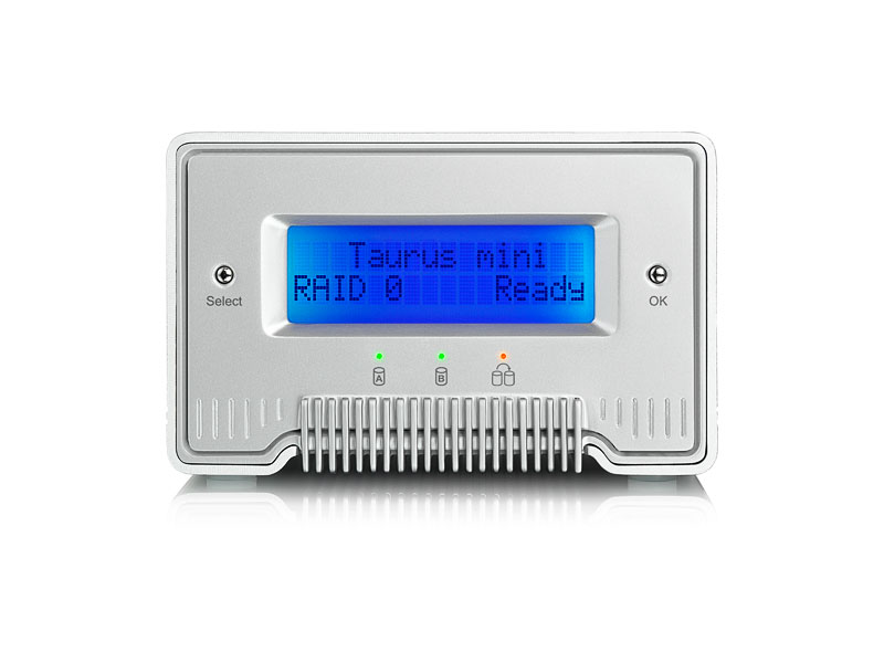 The Taurus Mini offers high performance with RAID 0 as well as secure data protection with RAID 1, a versatile interface for high speed data transfers and a built-in LCD display for the configuration of the device as well as the display of event messages. The 2.5" SATA hard drives can be replaced easily due to the removable tray system and the drives are kept cool by the extra large heat sink.