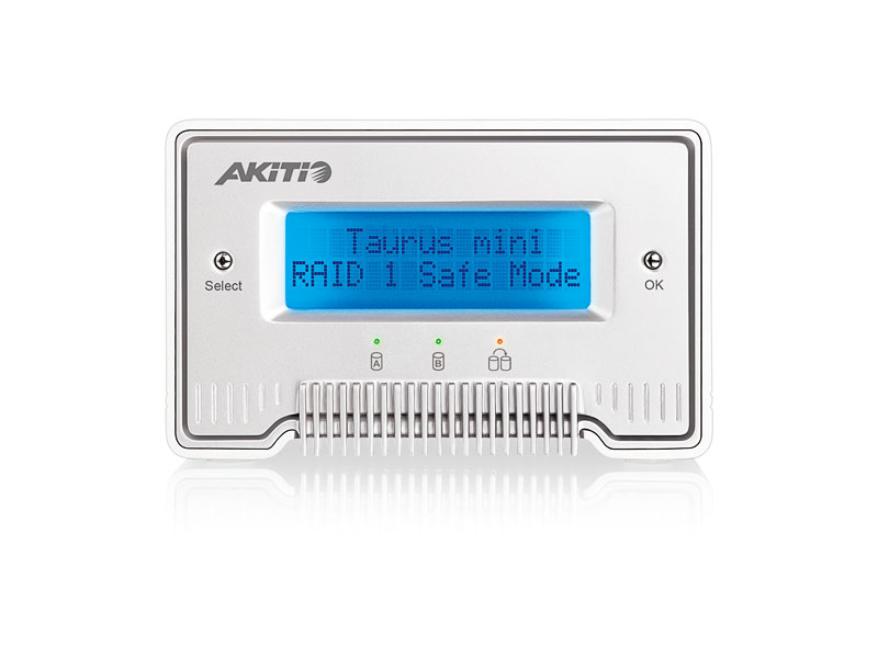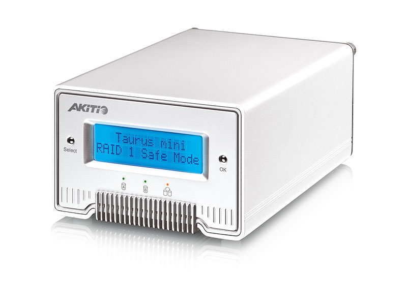The Taurus Mini offers high performance with RAID 0 as well as secure data protection with RAID 1, a versatile interface for high speed data transfers and a built-in LCD display for the configuration of the device as well as the display of event messages. The 2.5" SATA hard drives can be replaced easily due to the removable tray system and the drives are kept cool by the extra large heat sink.