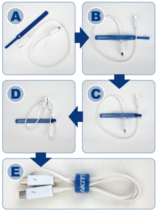 Simply tie the strap to one end of the cable, fold the cable and then wrap the velcro strap around it to hold it in place.
