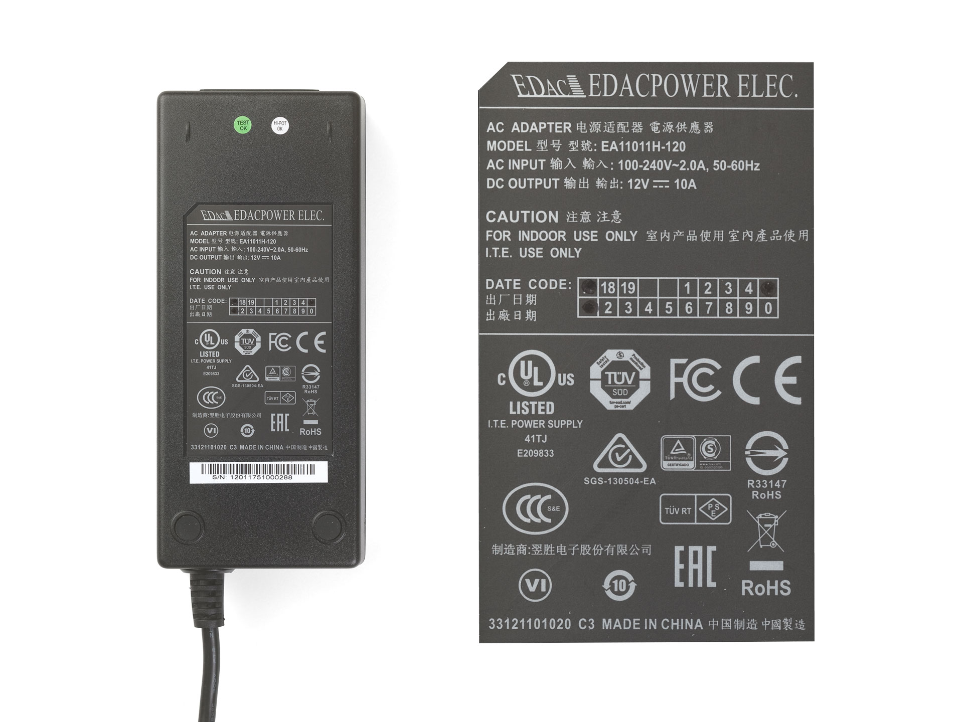 AC adapter with DC +12V/10A output