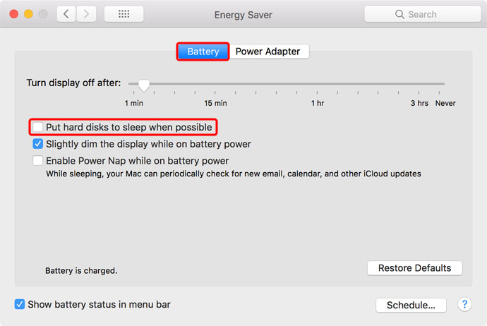 - Disable the option to put hard disks to sleep when possible.