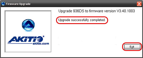 - When the upgrade is completed, click Exit to close the program. After the firmware update, the system will restart by itself to load the new firmware, so the device will be disconnected and mounted again.