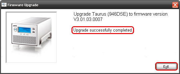 - When the upgrade is completed, click Exit to close the program. After the firmware update, the system will restart by itself to load the new firmware, so the device will be disconnected and mounted again.