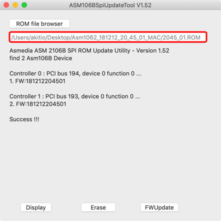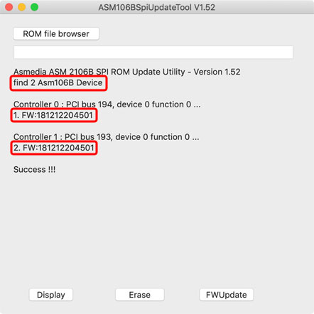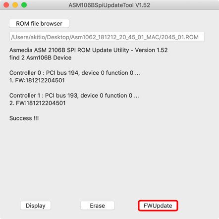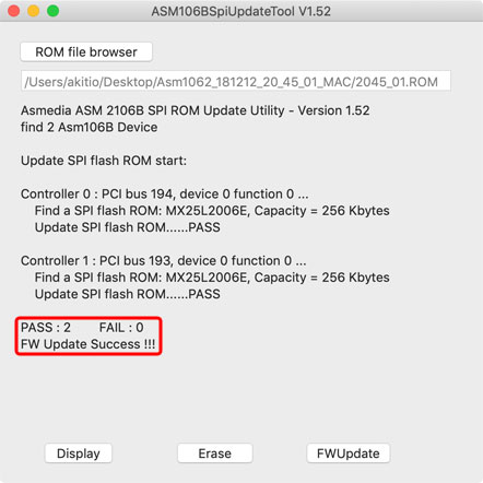 - When the update has been completed, the message "FW Update Success !!!" and "PASS:2" will be shown .