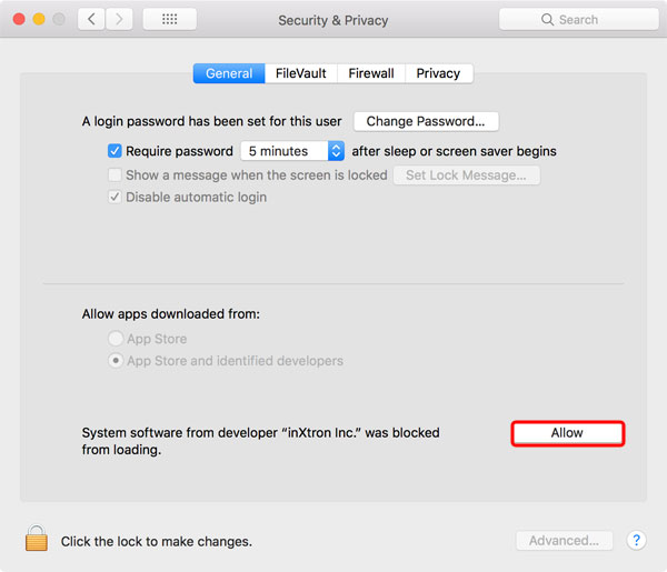 - In your system Preferences under Security & Privacy, if it's not already set to allow apps downloaded from 'App Store and identified developers', set this first and then click Allow to unblock the firmware utility from 'inXtron Inc..'.