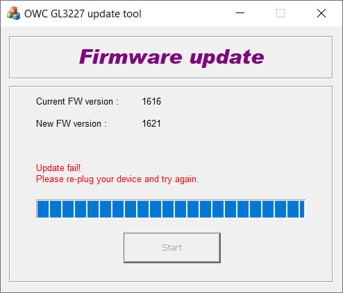 If the firmware update failed, close the firmware utility, eject the device and disconnect the Thunderbolt cable. Reconnect the cable and then run the firmware update again.