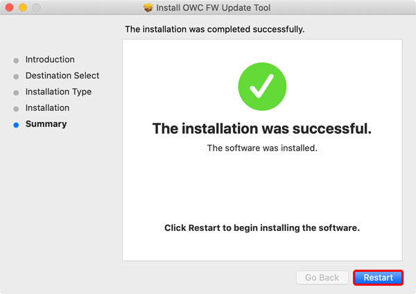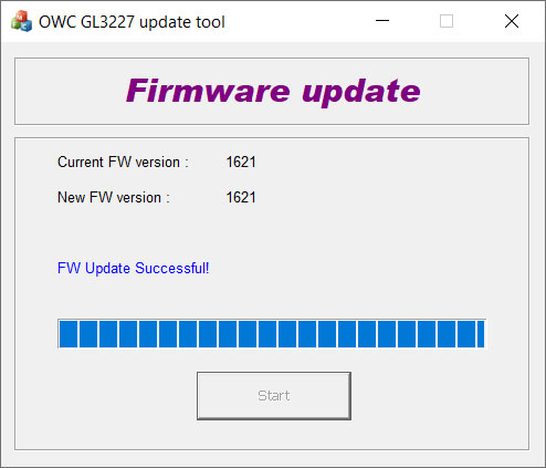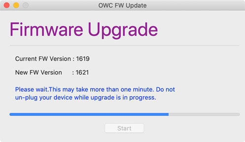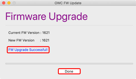 - Safely eject the drive, disconnect and reconnect the Thunderbolt cable, then wait a few seconds for the firmware utility to detect your device. When you see the "FW Upgrade Successful!" message, click Done to close the app.