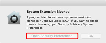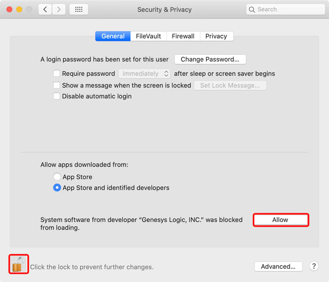 - Go to your system Preferences and open Security & Privacy. Click the lock to make changes and if it's not already set to allow apps downloaded from 'App Store and identified developers', set this first and then click Allow to unblock the firmware utility from 'Genesys Logic, INC.'.