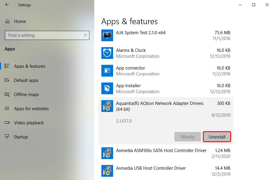 - If you have previously installed the Aquantia Network Driver, please go to Settings > Apps, select the Aquantia Network Driver and uninstall it.