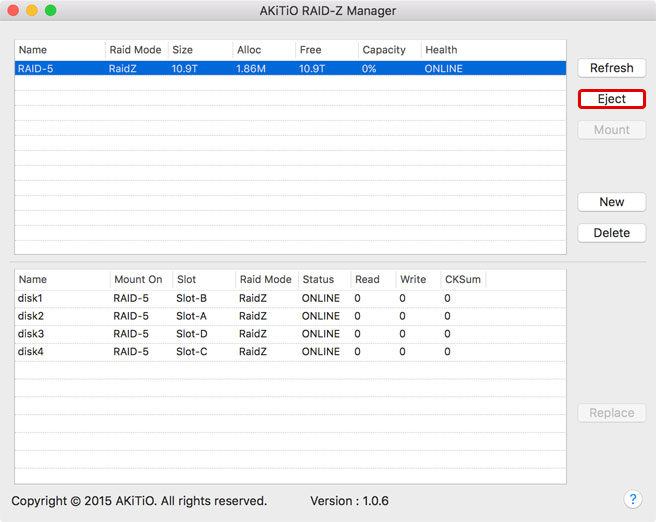 - Click Eject to eject the RAID set when you plan on disconnecting or turning off the external drive. Simply pulling the drive icon to the trash is not enough to eject the RAID set.