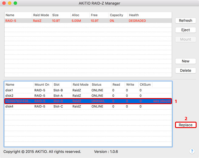- Select the faulty disk and click Replace.