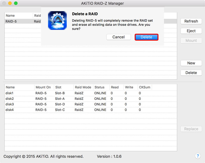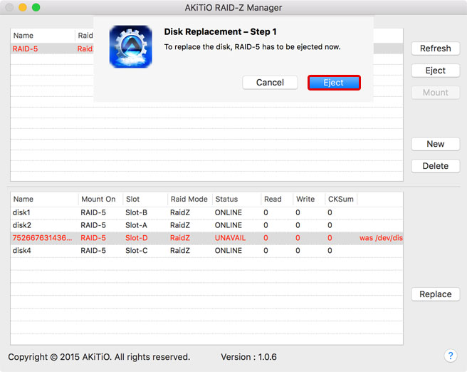 - When prompted, click Eject to eject the RAID set.