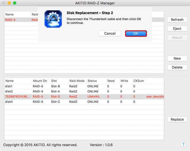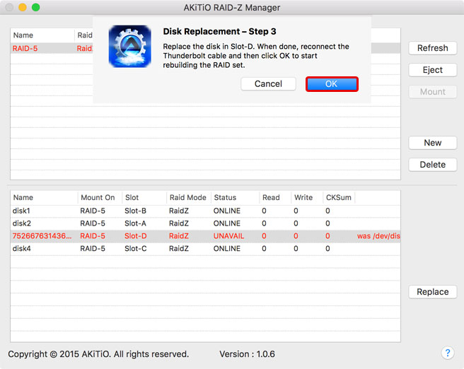 - Replace the faulty disk. When done, reconnect the Thunderbolt cable and then press OK to start rebuilding the RAID set.